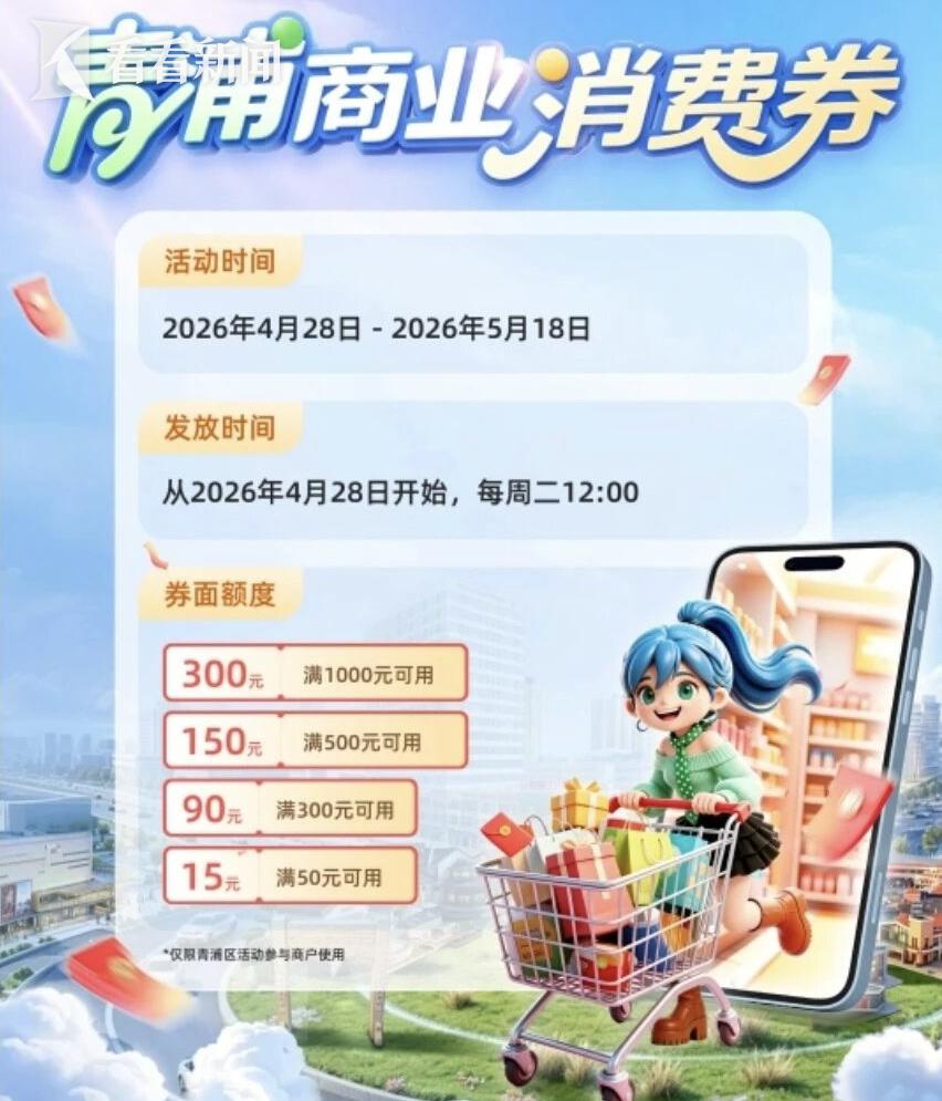 本次商业消费券活动自4月28日起至5月18日止,共分三轮发放,每轮于周二12:00准时开启:第一轮4月28日12:00至5月4日23:59;第二轮5月5日12:00至5月11日23:59;第三轮5月12日12:00至5月18日23:59。所有在沪人员(含域外来沪人员)均可通过支付宝App参与。只需将定位设为上海,在首页搜索“青浦消费券”或点击首页氛围图进入领券页面,先到先得。每轮每名用户限领一张,消费券领取后将自动存入卡包。