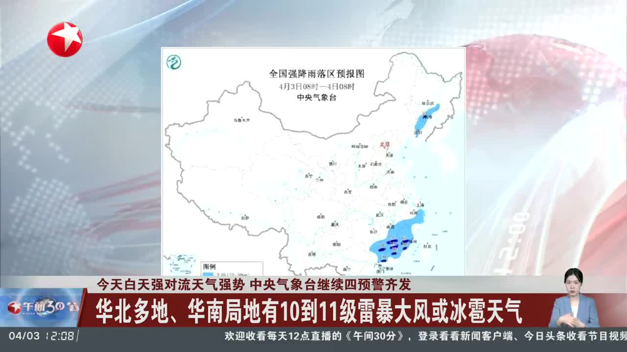 今天白天强对流天气强势 中央气象台继续四预警齐发 华北多地、华南局地有10到11级雷暴大风或冰雹天气