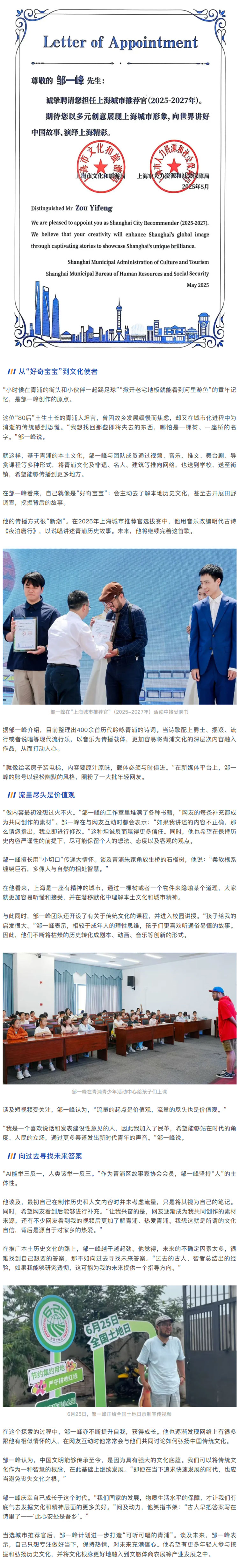 今年,邹一峰入选“上海城市推荐官”(2025-2027年)。未来三年,他将作为上海文旅的“代言人”,深度参与城市文化推广,用国际化的表达传递上海声音。