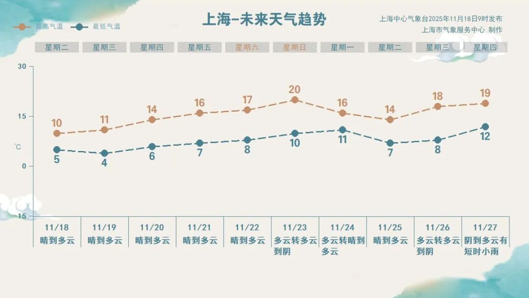 今晨全市大部分地区最低气温在3~6℃之间,是入秋以来最冷的一个早晨。7时30分,上海中心气象台解除了大风和寒潮双蓝预警信号,表明寒潮带来最明显天气变化的时段过去。接下来上海将主要受高气压控制,风力渐小,多晴好天气。白天气温开始逐日上升,今天最高气温在10℃左右,周三11℃,周四14℃......周后期气温回升至寒潮前水平。