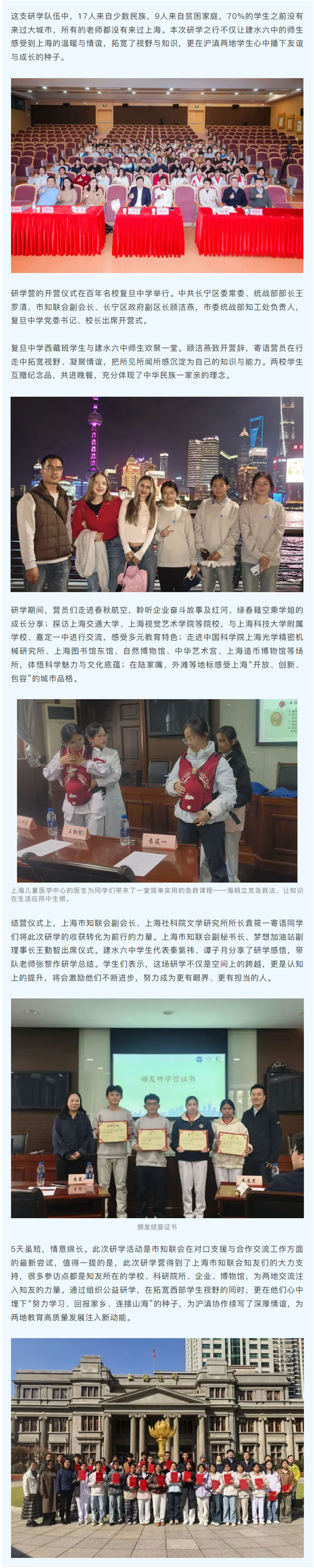 11月中旬, 在上海市知联会的精心策划推动下,建水六中29名师生跨越千山万水,奔赴上海,开启了一场为期5天的公益研学之旅。