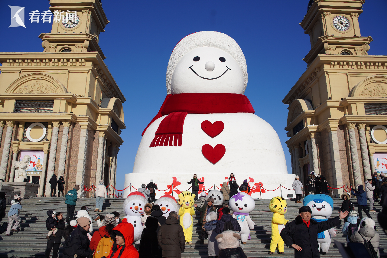 头戴红帽、面带微笑的哈尔滨群力音乐公园网红大雪人于16日正式建成,温暖回归。