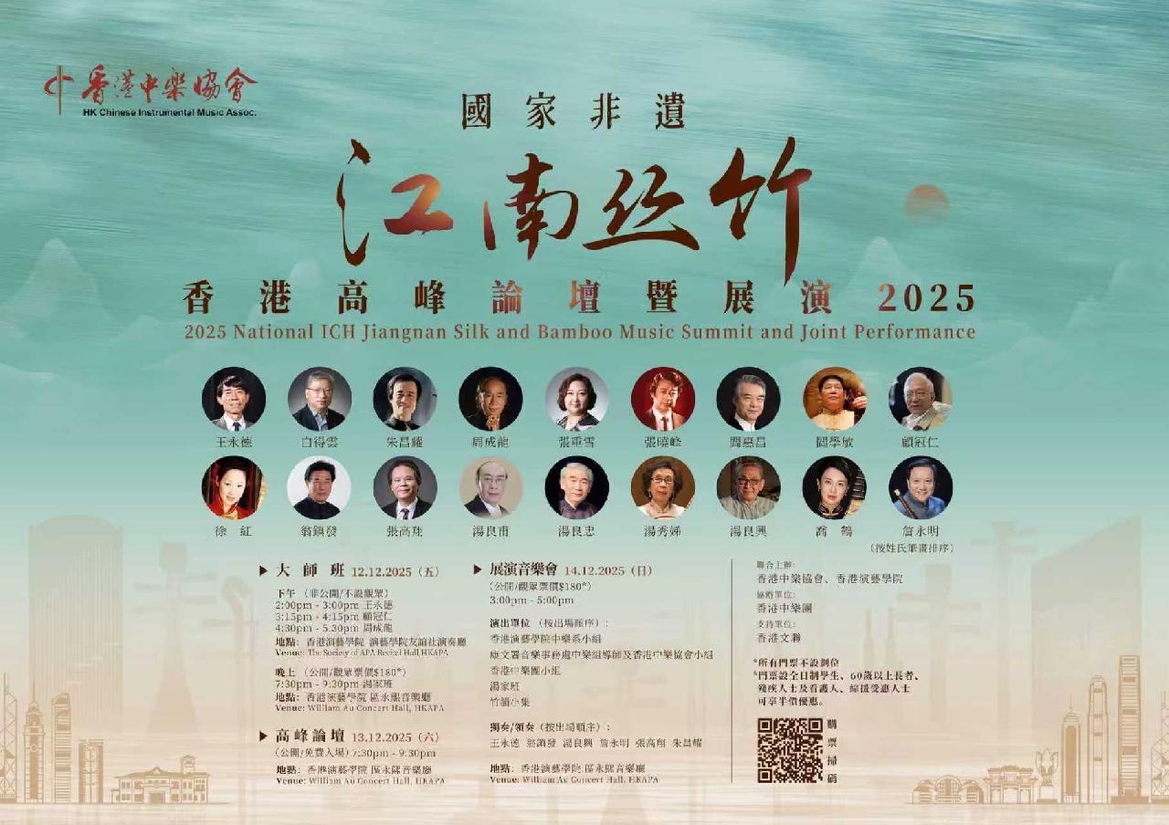 2025年12月12日至14日,由香港中乐协会与香港演艺学院联合主办、香港中乐团协办,在香港演艺学院成功举办一系列音乐界的盛会-《国家非遗江南丝竹香港高峰论坛暨展演2025》。这项活动汇集了当今最具权威性的海内外专家,共同致力于推动这一被列为国家级非物质文化遗产之艺术形式的传承与发展。