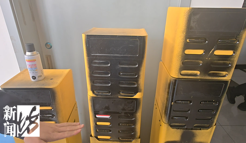 他会拿出他之前购买的一个黑色喷罐,在这些充电宝的机器上面进行喷涂,将有二维码、识别码这些可以让它正常使用的东西进行损毁,导致整个机器无法使用。