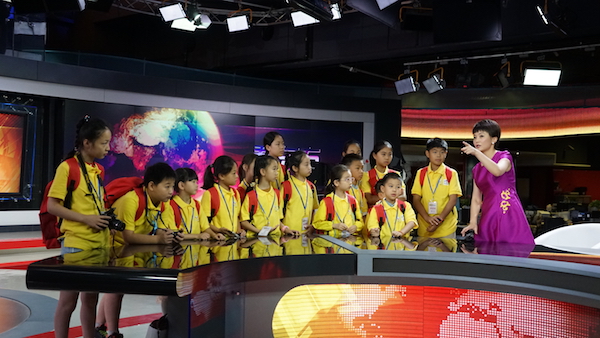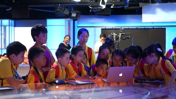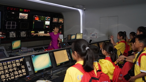 在世界一流的演播厅“魔都之眼”,小记者们聆听主持人的讲解。