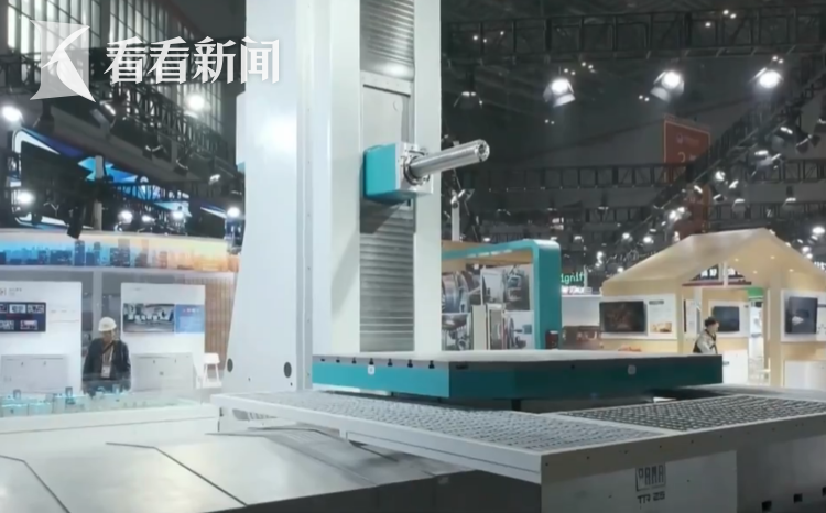 这台数控镗铣床高度近7米,重达45吨,是技术装备区的最大展品。随着大型展品的安装完成,现场展台的主体结构搭建已基本完成。