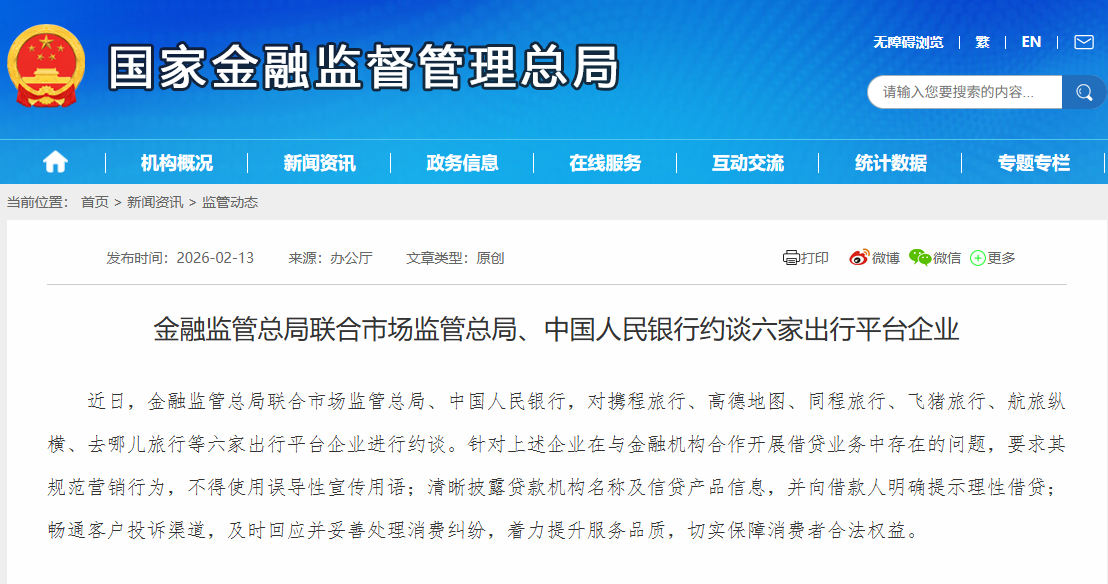 近日,金融监管总局联合市场监管总局、中国人民银行,对携程旅行、高德地图、同程旅行、飞猪旅行、航旅纵横、去哪儿旅行等六家出行平台企业进行约谈。针对上述企业在与金融机构合作开展借贷业务中存在的问题,要求其规范营销行为,不得使用误导性宣传用语;清晰披露贷款机构名称及信贷产品信息,并向借款人明确提示理性借贷;畅通客户投诉渠道,及时回应并妥善处理消费纠纷,着力提升服务品质,切实保障消费者合法权益。