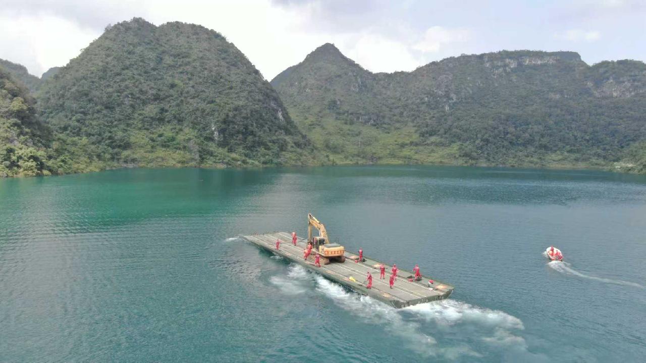 在德保县多睦村多旁水库渗水点,救援队员携带应急动力舟桥奔赴现场,由于现场无陆路通行条件,且封堵体需实现双面防渗,处置难度极大。救援队伍率先拼组动力舟桥,打通水上运输通道,确保重型设备与物资顺利送达作业面。
