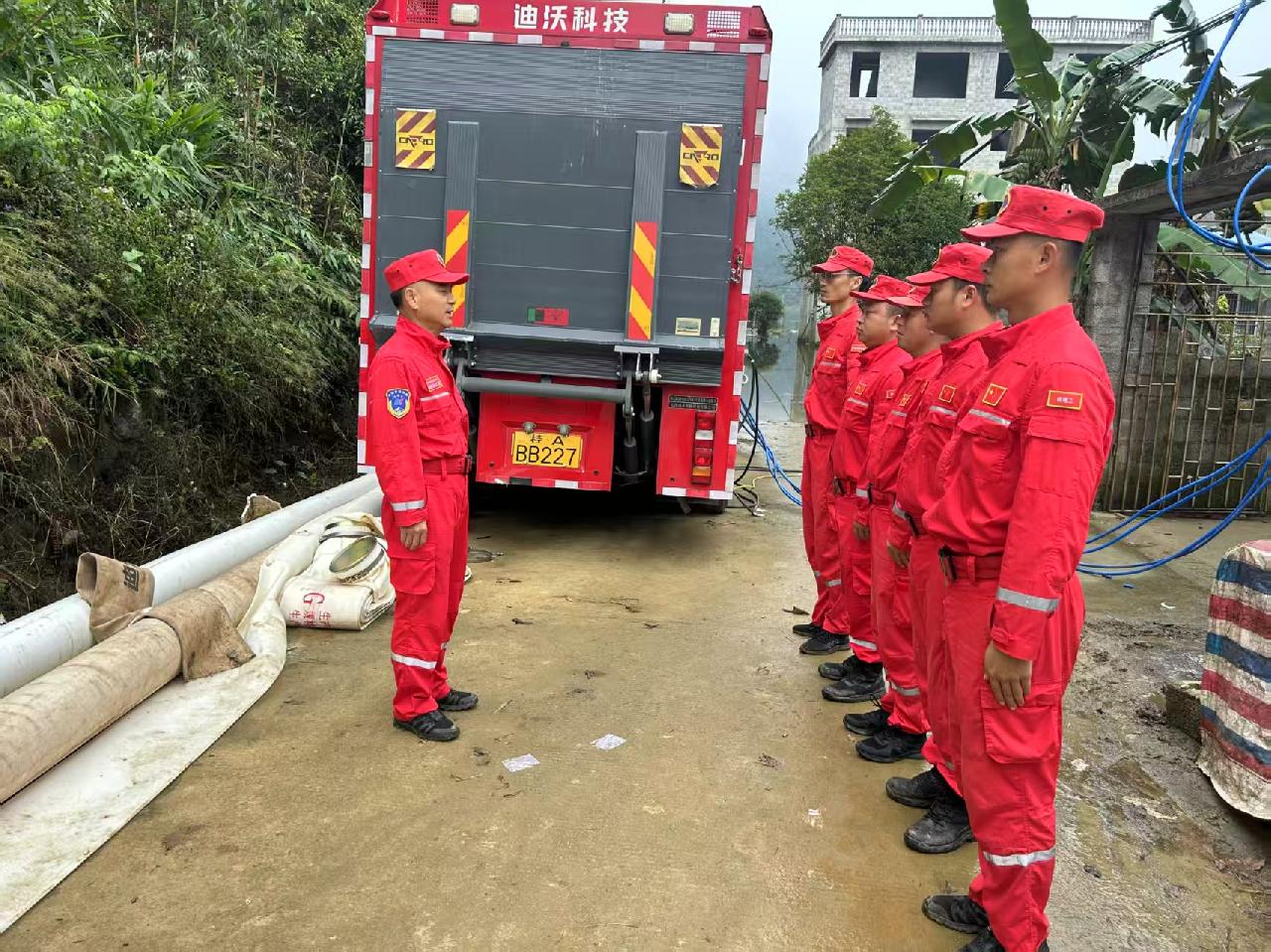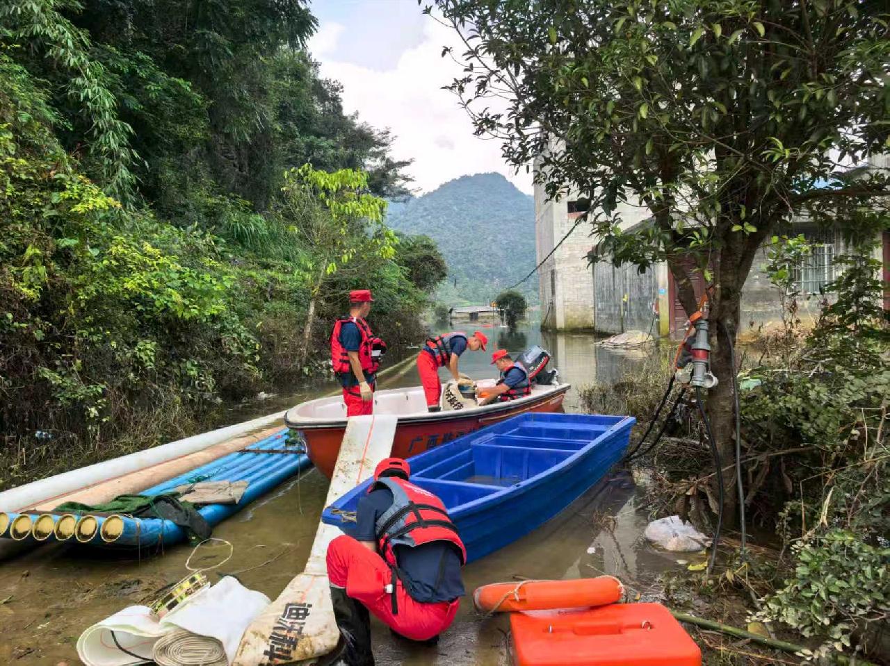 救援队伍到达指定集结点后,根据地方联合指挥部统一调度,兵分多路,同步展开靖西市渠阳镇大力屯积水抽排、德保县多睦村多旁水库渗水点处置两项重点任务。