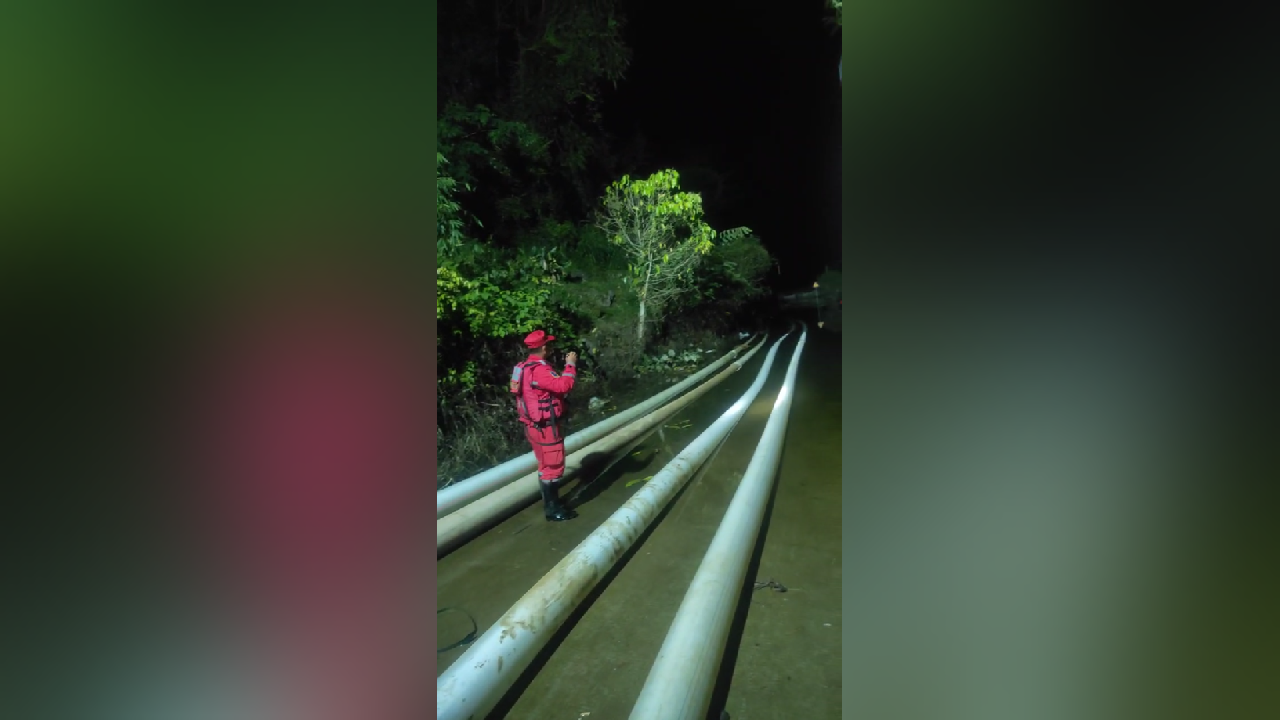 在渠阳镇大力屯,救援人员针对该任务点“作业面狭窄、抽排距离长”的难点,队伍创新采用“单线接力抽排”与“柔性管网系统”相结合的方案,科学布设多台大流量低扬程水泵,有效提升抽排效率。经过持续奋战,截至20日7时30分,现场累计铺设排水管约4.8公里,抽排积水约11万立方米,屯内水位下降到49厘米处。
