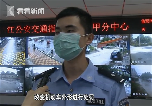 洛江交警大队马甲中队民警张一龙排说:“气管是没有改,但是他的车标、车尾灯,还有外形,进行了改变。这个是违反改变机动车外形,所以我们对他改变机动车外形进行处罚。处罚是罚款500元,然后责令他恢复汽车原状。”