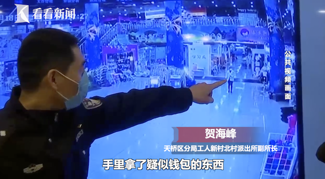 济南市公安局天桥区分局工人新村北村派出所副所长贺海峰:“她现在出来了,手里拿着疑似钱包的东西,他把这个钱包放在手机下面。”