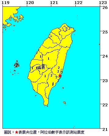 台东一波未平一波又起,刚遭台风“尼伯特”摧残,今天(14日)上午11:32又发生规模4.4级地震。根据台湾地震部门报告,震央位于台东县政府北偏东方5.5公里处(北纬23.17度,东经121.38度),深度24公里。岛内东部和南部地区皆有震感,台东3级,花莲2级,高雄1级,云林1级,南投1级,嘉义1级,彰化1级。所幸,目前没有伤亡报告传出。