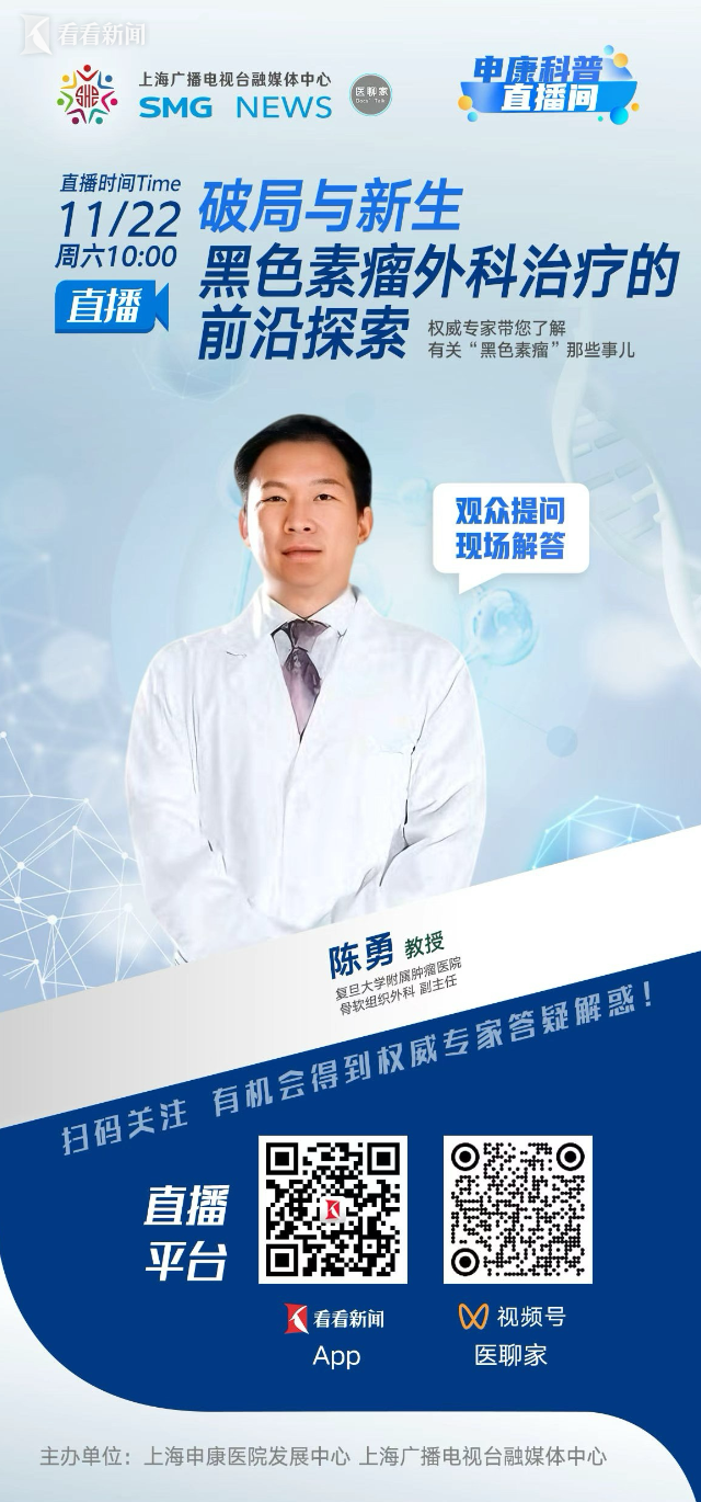 黑色素瘤是一种高度恶性的皮肤肿瘤,早期极具隐匿性,而一旦进展,转移速度快、治疗难度大,被誉为“最凶险的皮肤癌”。随着精准医学与多学科诊疗理念的不断推进,外科治疗在黑色素瘤防治体系中的地位正在发生深刻变化——从传统的病灶切除,到联合哨兵淋巴结活检、术后免疫及靶向治疗的综合管理,外科医生正成为精准治疗的“破局者”。本期节目中,我们非常荣幸地邀请到了复旦大学附属肿瘤医院骨软组织外科副主任陈勇教授做客直播间。