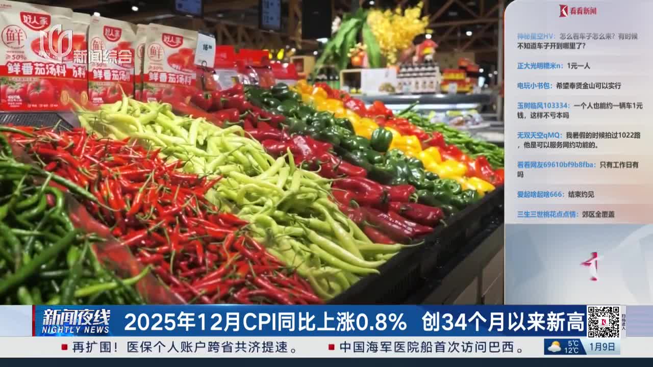 2025年12月份,全国居民消费价格同比上涨0.8%。其中,城市上涨0.9%,农村上涨0.6%;食品价格上涨1.1%,非食品价格上涨0.8%;消费品价格上涨1.0%,服务价格上涨0.6%。