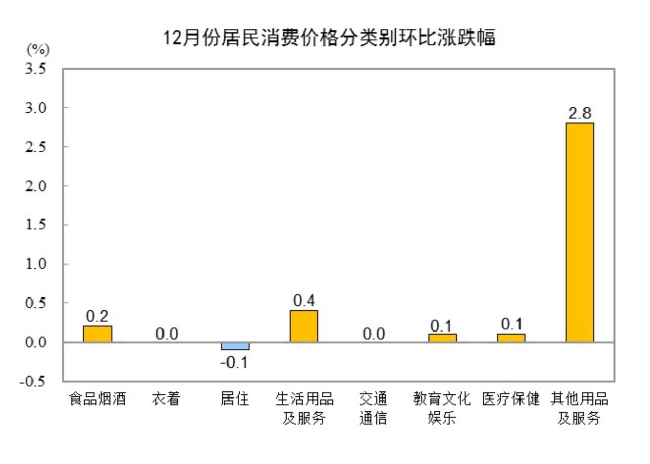 12月份,全国居民消费价格环比上涨0.2%。其中,城市上涨0.2%,农村上涨0.2%;食品价格上涨0.3%,非食品价格上涨0.1%;消费品价格上涨0.3%,服务价格持平。