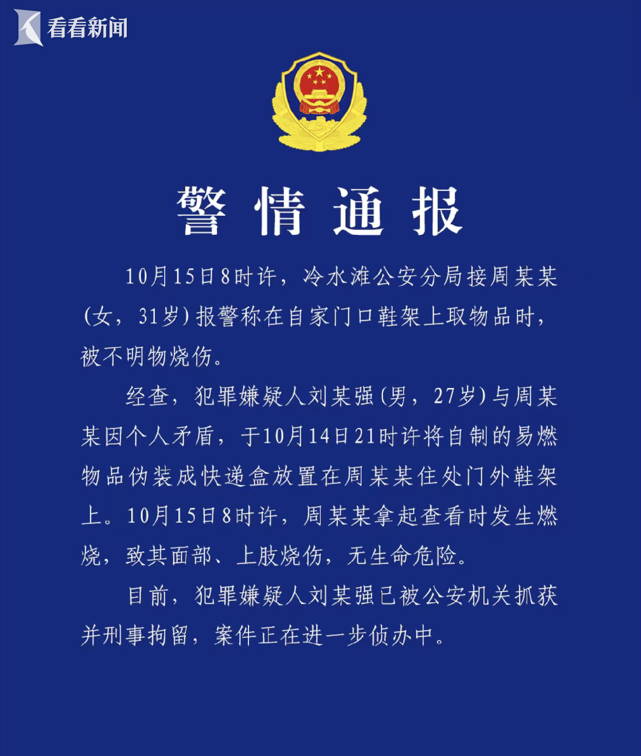 10月16日,湖南冷水滩公安分局通报“女主播被炸弹包裹烧伤”:犯罪嫌疑人刘某强(男,27岁)已被公安机关抓获并刑事拘留,案件正在进一步侦办中。