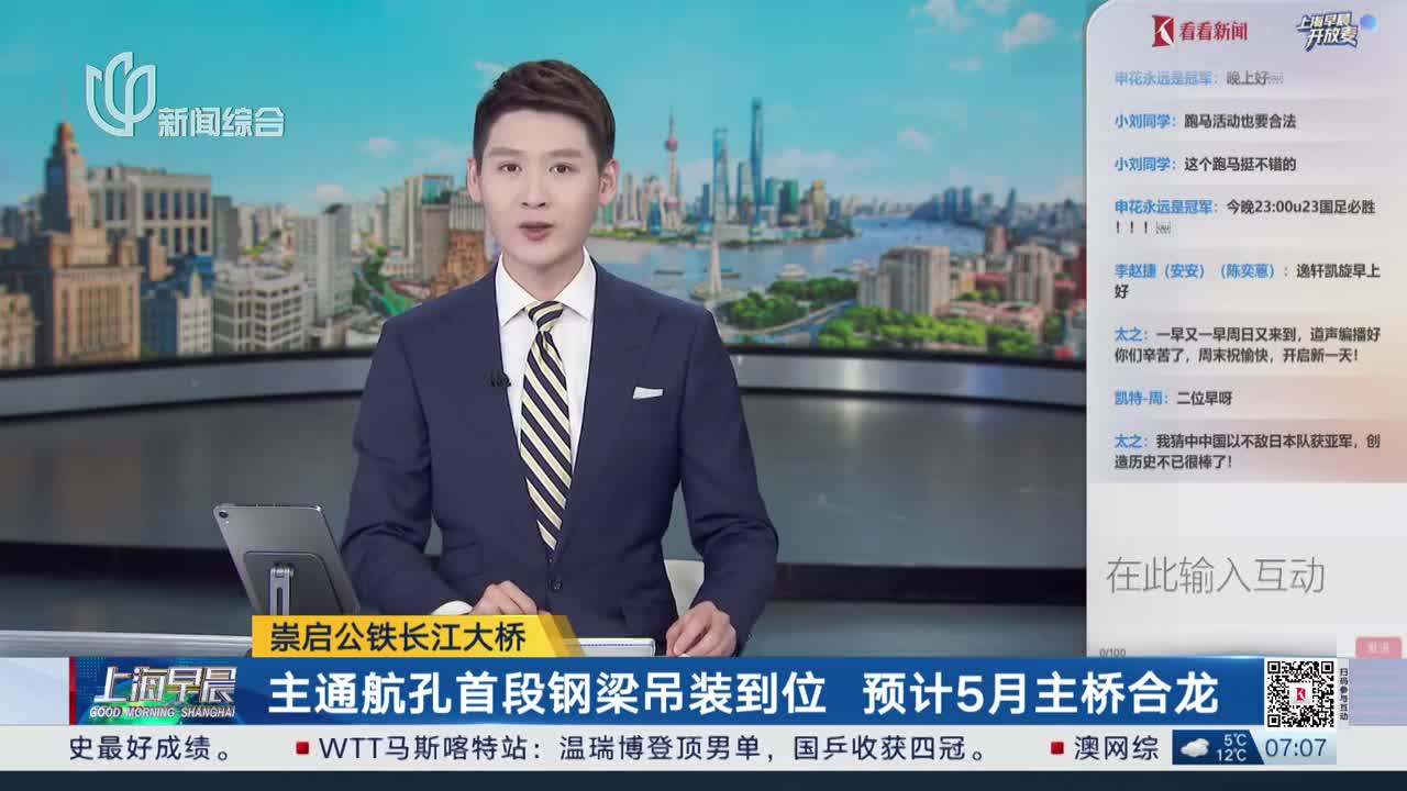 崇启公铁长江大桥 主通航孔首段钢梁吊装到位 预计5月主桥合龙