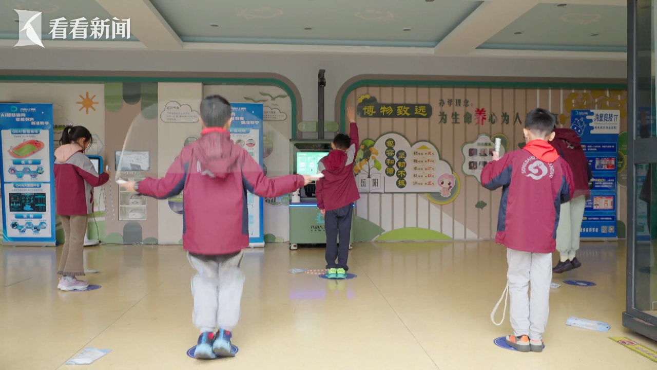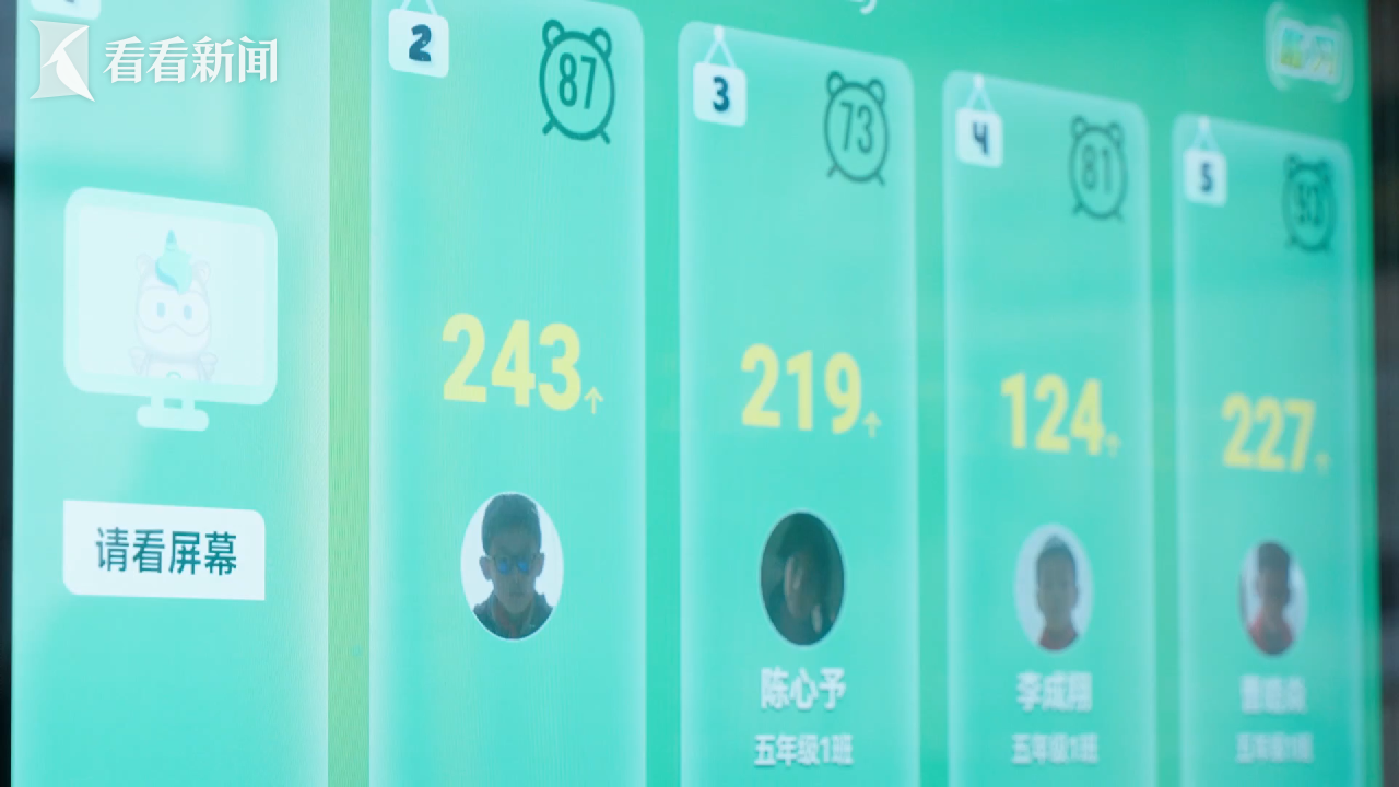 松江区岳阳小学五(1)班学生李馨宁说:“(AI跳绳系统)能看到我的进步,如果破纪录还会提醒我。”