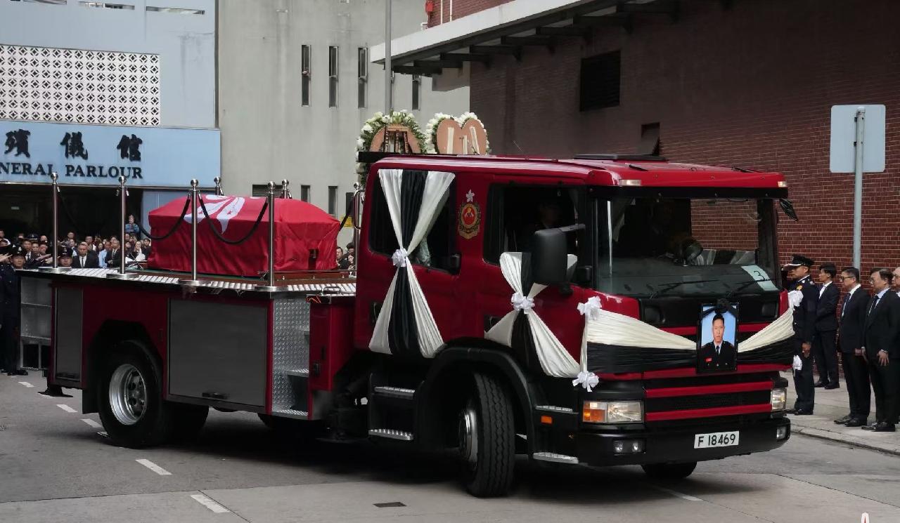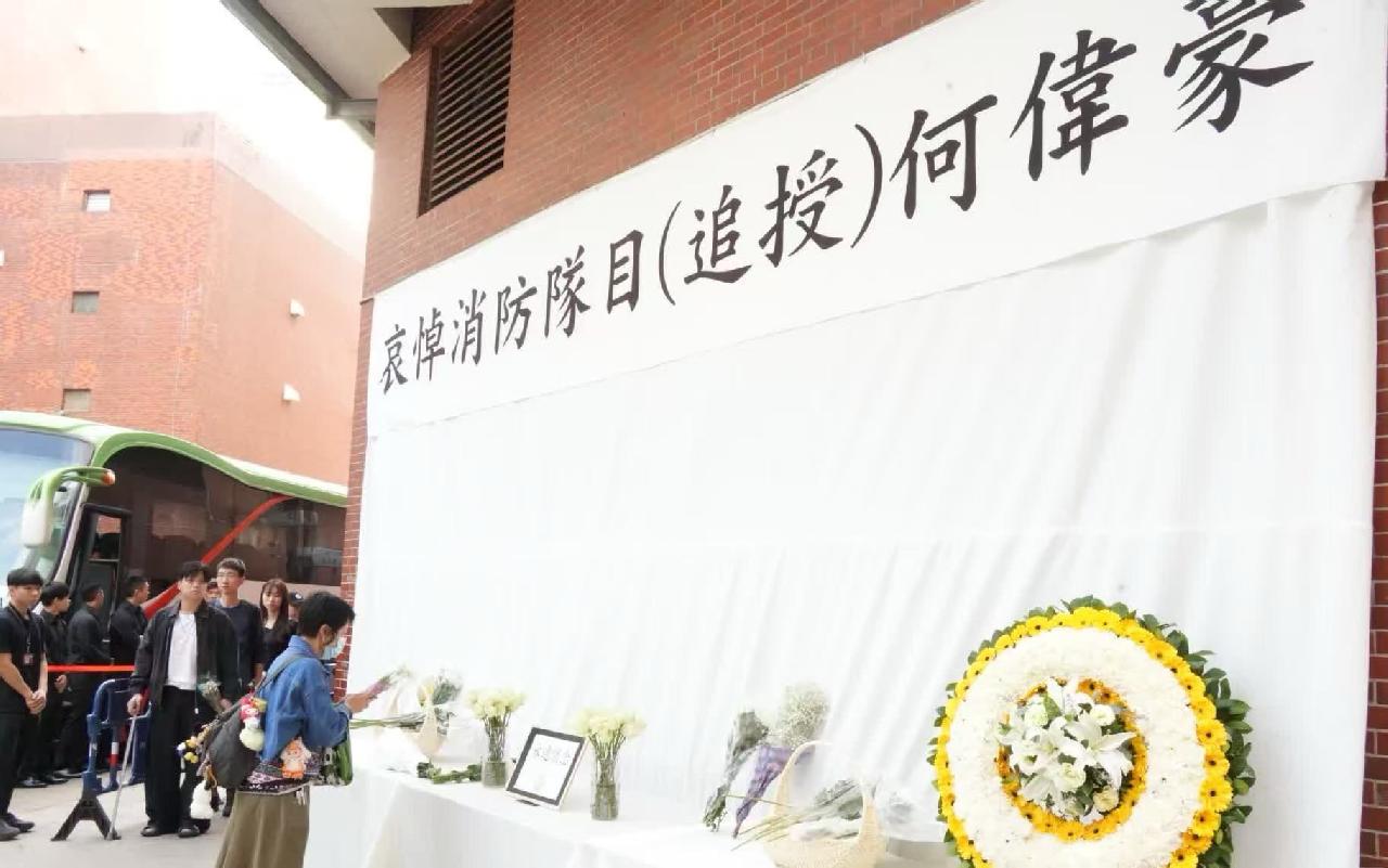 香港大埔宏福苑11月26日发生五级大火,造成严重伤亡。在灭火行动中不幸殉职的37岁消防员何伟豪,昨日(18日)于红磡世界殡仪馆设灵,特区政府消防处今日(19日)为何伟豪举行最高荣誉丧礼。多位市民自发到现场献花哀悼。