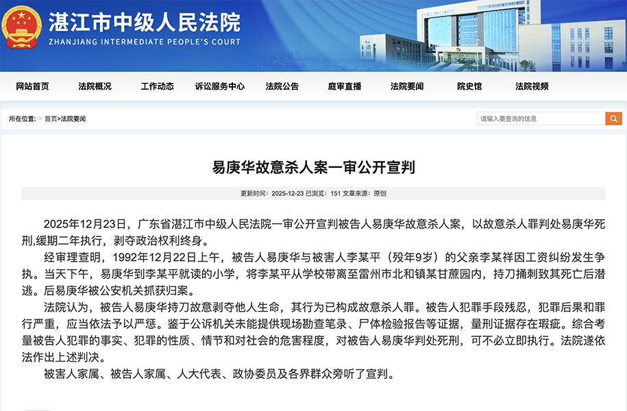 12月23日上午,备受外界关注的“姐姐为亡弟追凶27年”迎来一审宣判,被告人易庚华被判处死刑,缓期二年执行,剥夺政治权利终身。