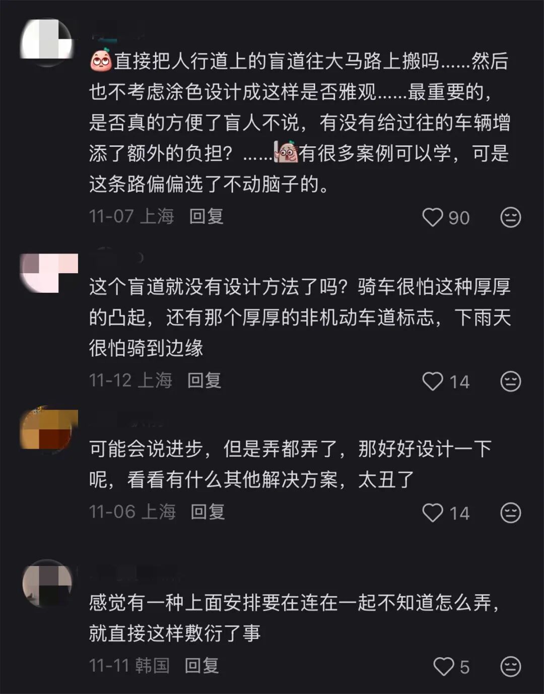 目前,人行横道的盲道是没有任何标准的,所以怎么做也会有其他方面呃考量,比如说尽可能让车辆不太过振动。