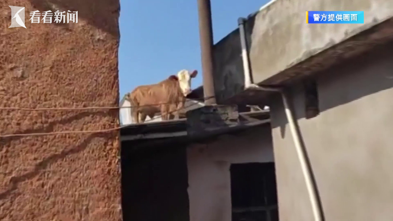 武大爷和老伴想尽各种办法,都没能把小牛从房顶上弄下来,只好报警求助。原来,当天牛圈拦牛的杆子被拿去清洗,小牛从牛圈跑出来,趁家里没人,爬上了房顶。