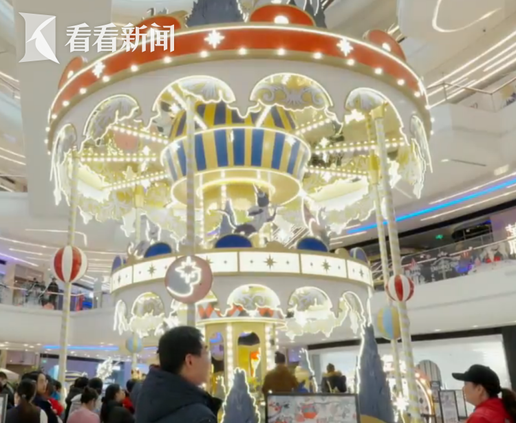 商场里,高达18米的双层旋转木马灯光璀璨,也在排长队。