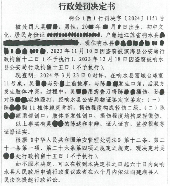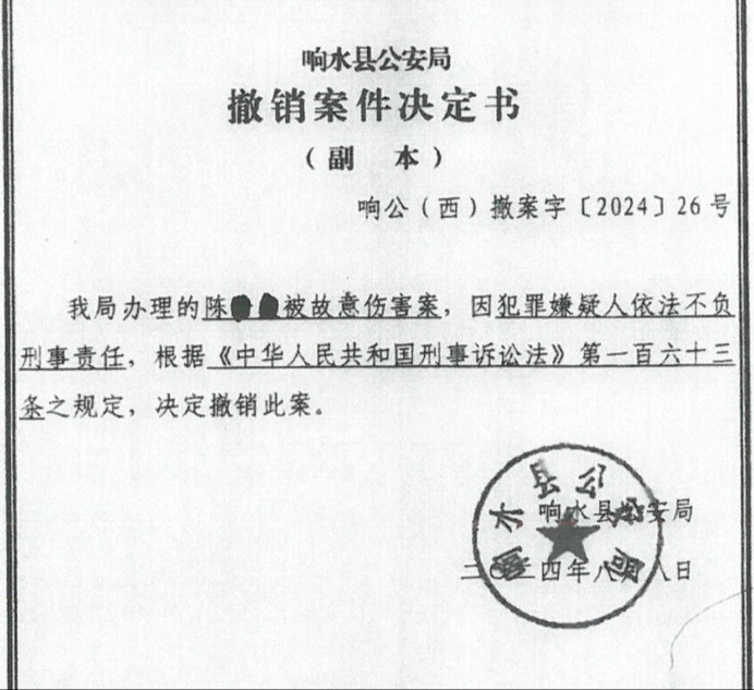 2024 年 8 月 8 日,响水县公安局作出撤销案件决定书,因犯罪嫌疑人依法不负刑事责任,决定对吴某、孙某均处行政拘留十五日(不予执行)。