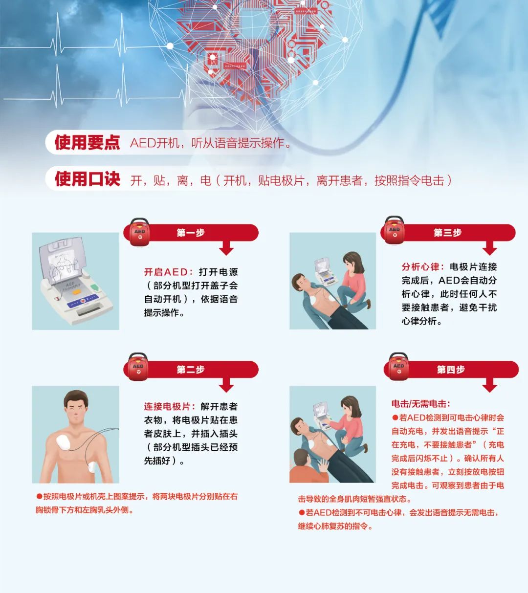 使用口诀:开,贴,离,电(开机,贴电极片,离开患者,按照指令电击)
