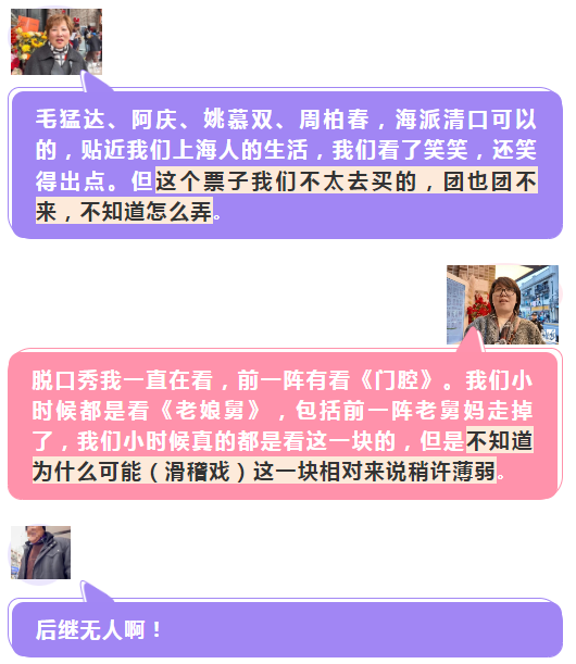其实城市和社会都在发展进步,现在我们还有很多年纪轻的人喜欢的东西,都应该在滑稽戏里和独角戏里有所体现,现在是一个 "破圈" 的时代,希望不同的模式吸引不同的观众,让我们剧场里坐得满满的,掌声多一点,笑声多一点,生意好一点。