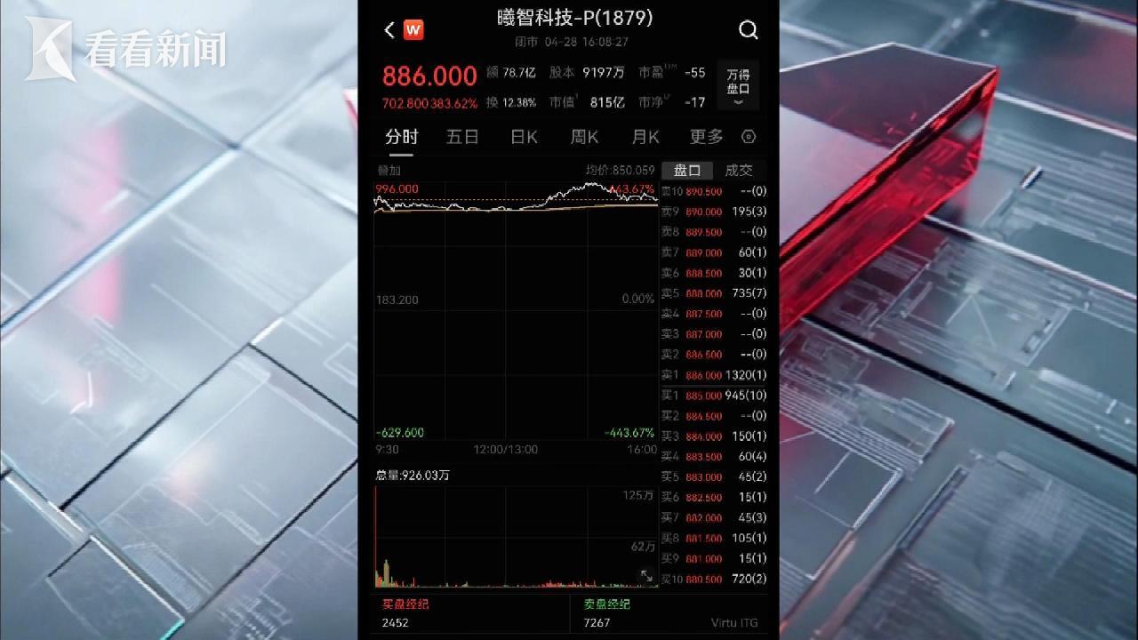 曦智科技上市首日的开盘价为880港元,较183.2港元发行价上涨超380%。截至收盘,企业股价定格在每股886港元,涨幅仍超380%。