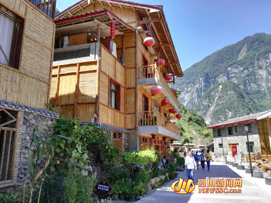 如今,“雪山新村”与宝兴县城隔河而坐,在半山腰上已建立起了一个休闲旅游民俗度假村。村民的房屋采用了传统川西建筑风格,层数一般为2到3层,内部以钢筋混凝土结构为主体,外部以木材、竹片、瓦片和小鹅卵石塑造风貌,与新村背后的青山相衬托,像是一幅幅浓郁的油画。