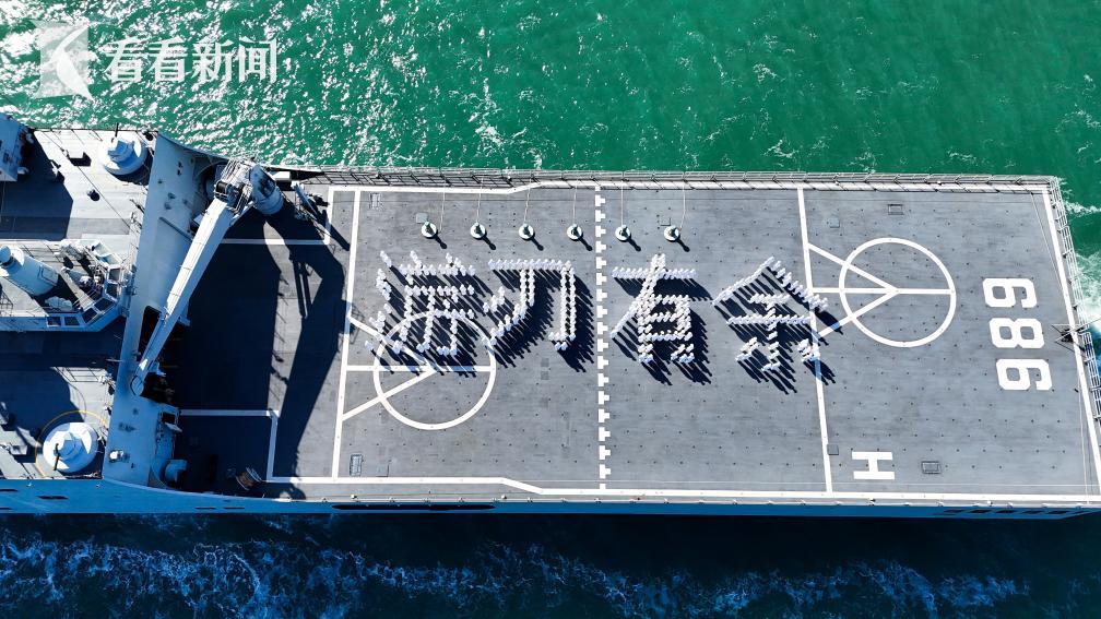 航渡期间,来自海军工程大学和海军航空大学的军校学员,在综合登陆舰长白山舰的飞行甲板上,摆出“从从容容”和“游刃有余”字样。