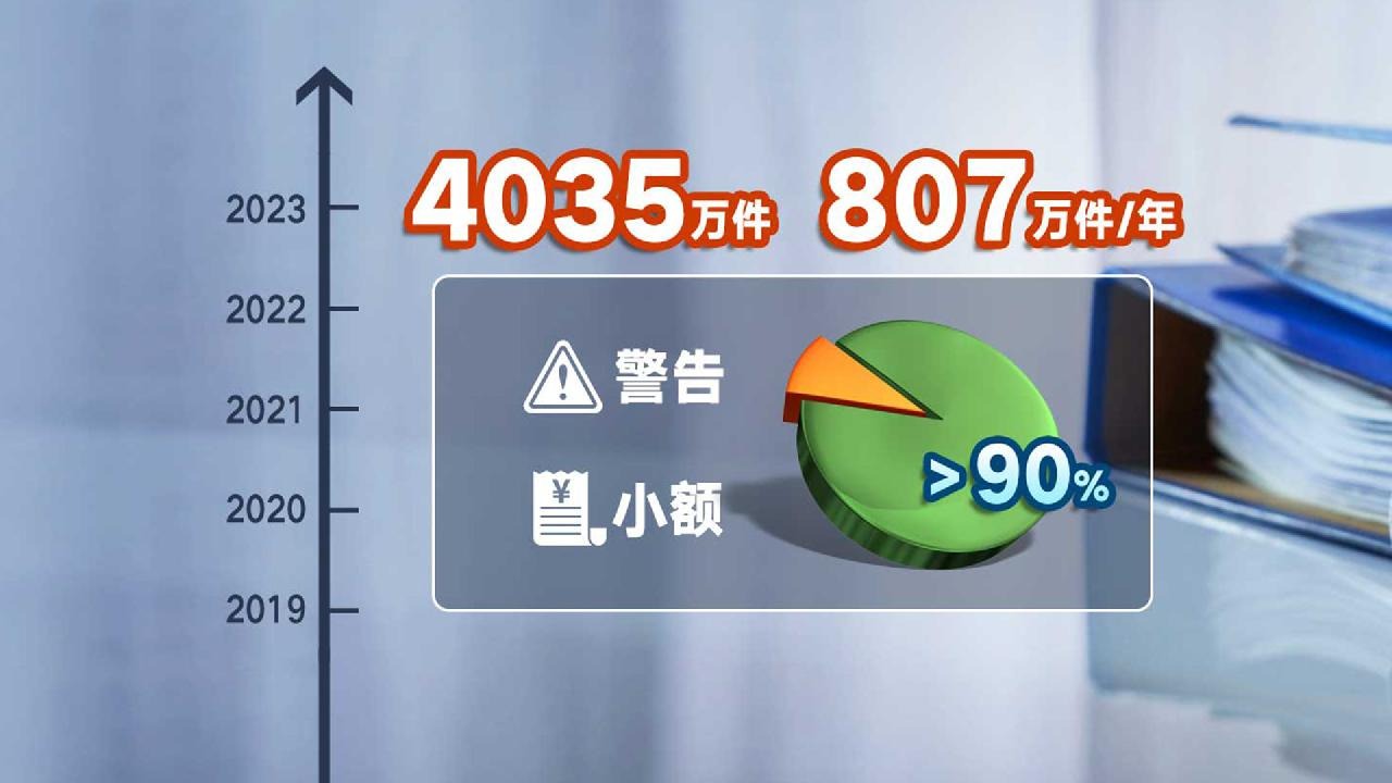 从2019年到2023年,全国公安机关查处治安案件4035万件,年均807万件,其中90%以上是处以警告、小额罚款等惩戒的轻微违法。