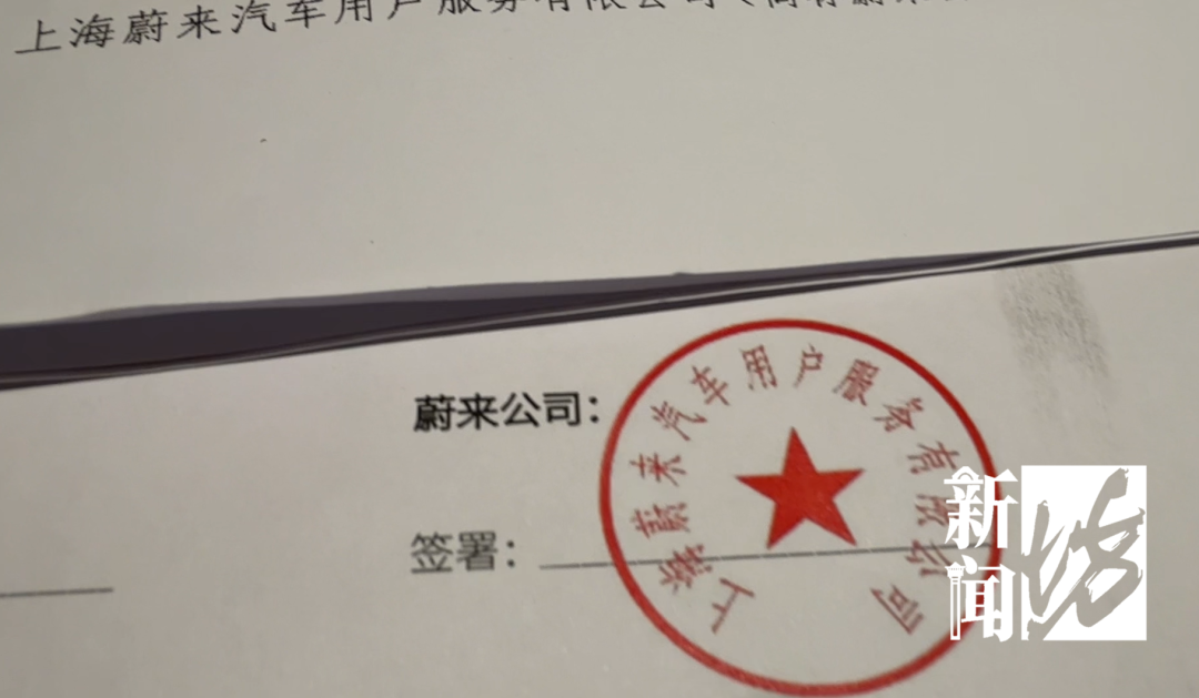 严女士说,由于对方给了一份盖有蔚来公章的协议,因此比较信任,且严某身着蔚来工作服,还在蔚来交付中心牛屋里进行,所以就没考虑过这件事情的虚假性。