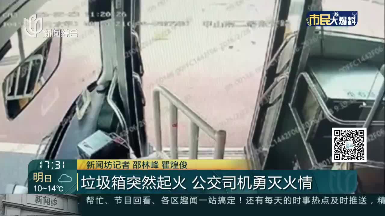 垃圾箱突然起火 公交司机勇灭火情