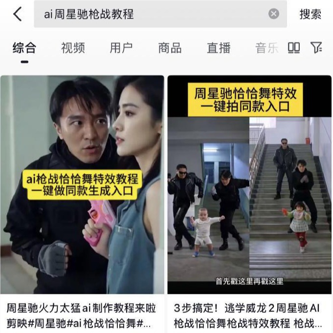 记者在短视频平台上搜索发现,AI周星驰视频数量的确很多。其中一个叫做“周星驰火力太猛”的热门玩法,截取自周星驰电影《逃学威龙》。一些视频明显看得出来是AI合成供娱乐的,比如将原片段中的角色替换成小动物、小婴儿等等;而另一些AI视频则让人有真假难辨之感,人物动态、镜头运动都相当丝滑、合理,以至于有网民留言说:到底哪个是原版?