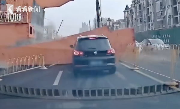 一则行车记录仪显示,一龙门吊倒在道路上压到一辆正在行驶的轿车上,轿车从后排开始被完全压扁。