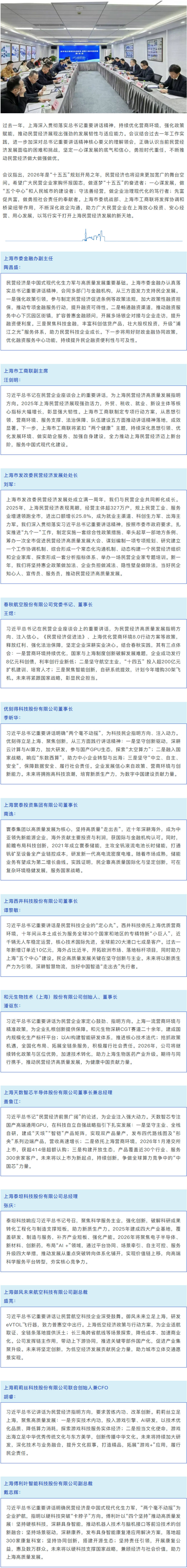 2026年2月10日,由上海市委统战部主办的“深学笃行重要讲话精神 凝聚力量共促发展”座谈会在中国新闻社上海分社召开。上海市委统战部常务副部长王霄汉出席会议并讲话,上海市委金融办、上海市工商联、上海市发改委民营经济发展处相关负责同志,以及10位上海民营企业家代表作交流分享,畅谈发展体会与未来规划。