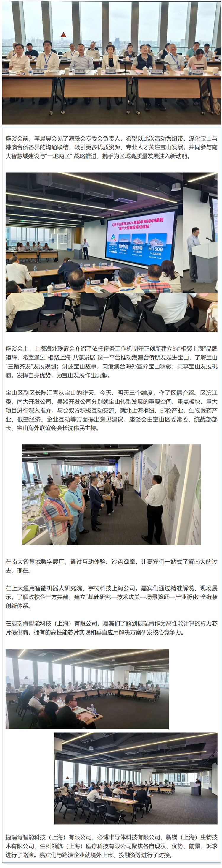9月29日,“相聚上海 共谋发展”上海海外联谊会走进宝山,助力南大智慧城建设主题活动举办。上海海外联谊会的理事、专委会委员等30余人来到宝山,了解区情区貌,实地见证南大地区转型蝶变,并为宝山“一地两区”建设建言献策。市委统战部常务副部长、市政府侨办主任、上海海外联谊会执行副会长董依雯,宝山区委书记李晨昊等出席。