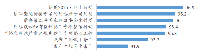 调查显示,网民对7项网络治理行动的支持率均在9成以上。其中,高达96.9%网民对开展“护苗2015·网上行动”表示支持,支持率最高。