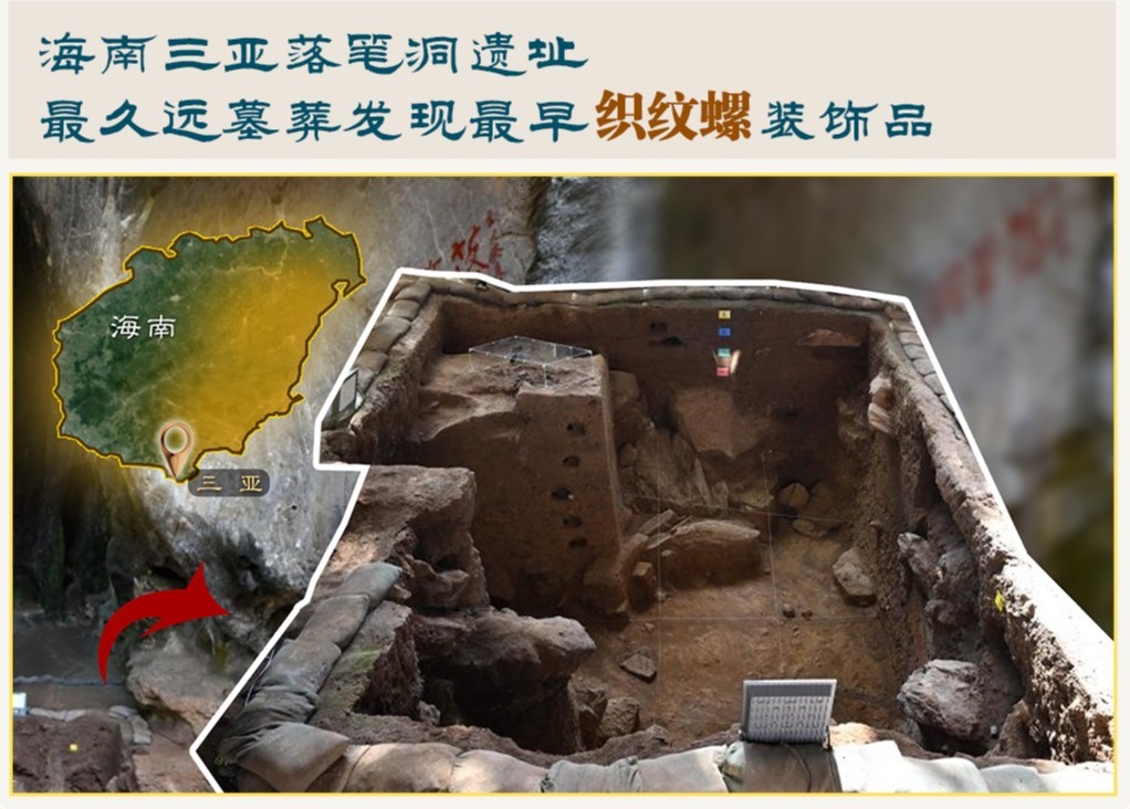墓主人年纪尚幼,葬式为侧身屈肢葬——在三亚的落笔洞遗址,考古人员发现一座距今约13000年至12000年的史前墓葬,这也是目前海南发现的年代最久远墓葬。墓主人头部与腰部的装饰品,则是目前国内见诸报道的最早织纹螺装饰品,对于研究海南岛史前文化习俗和与东南亚的文化交流极为难得。