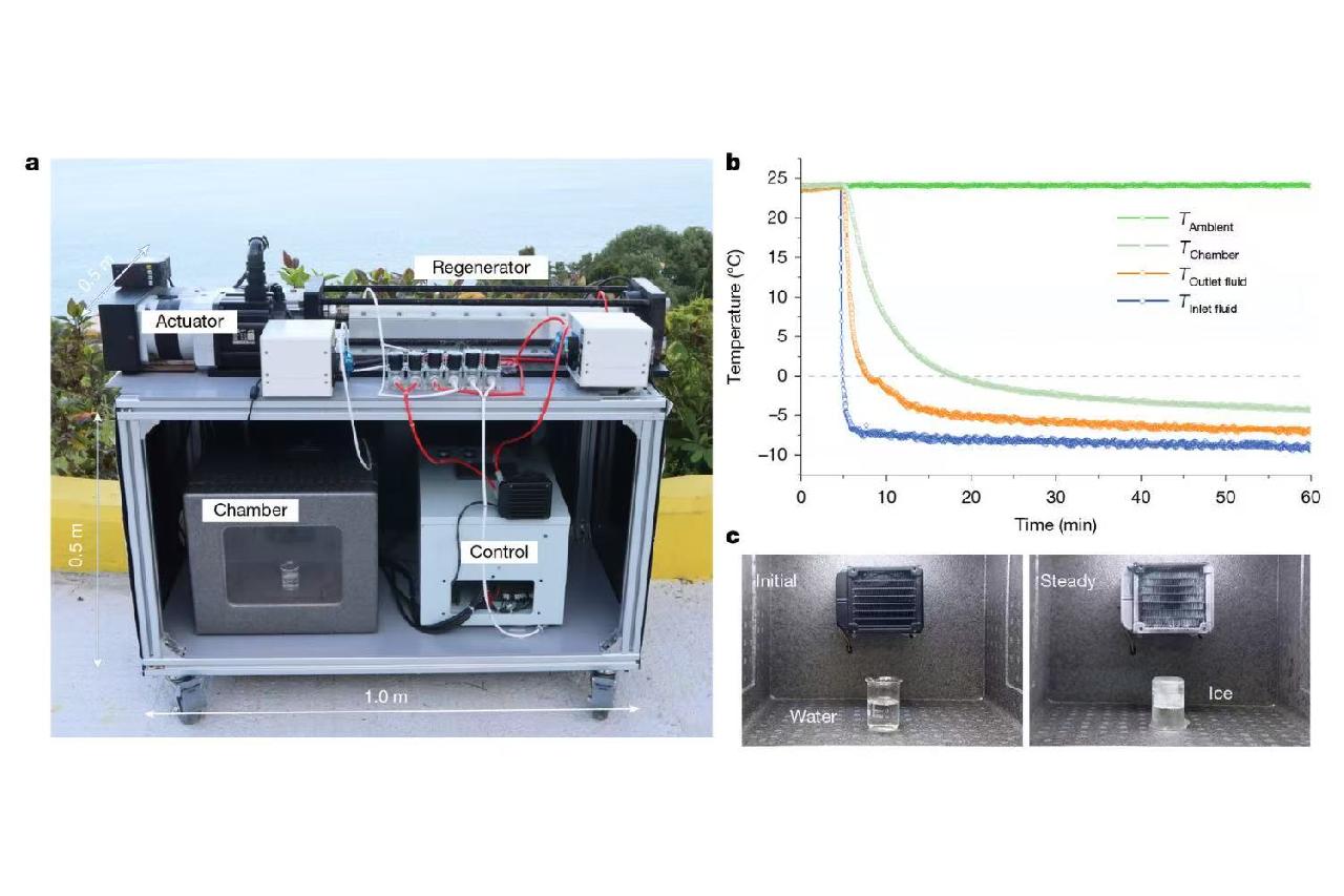 在一赫兹的运行频率下,这台桌面型装置成功实现了从室温热汇约摄氏24度到冷源温度摄氏负12度的跨越,温差达摄氏36度,为弹卡冷冻领域首次录得摄氏零度以下的冷源温度。研究团队将设备集成于一个体积为1.0×0.5×0.5m3(0.25立方米)的装置中,并在户外摄氏20至25度的环境下进行测试。装置产生的低温流体成功将一个小型隔热腔室内的空气温度在60分钟内稳定在摄氏负4度,并将腔室内20毫升蒸馏水在两小时内完全冻结成冰。这些测试证明了新技术的高效冷冻能力。在性能指标方面,在零温差条件下,该装置的单位质量制冷功率可达每克1.43瓦,系统能效最高达3.4,展现了相当可观的能效潜力。