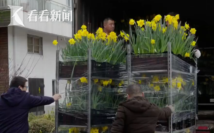 上午11点左右,两辆来自松江和南汇基地的卡车抵达复兴公园,郁金香、风信子、蜜蜂百合等热销花卉被及时补充到花市。