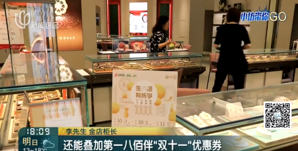 "双十一"的活动我们是计价黄金饰品每克可以优惠50元,镶嵌类的饰品部分可以八五折,还能叠加第一八佰伴"双十一"优惠券。