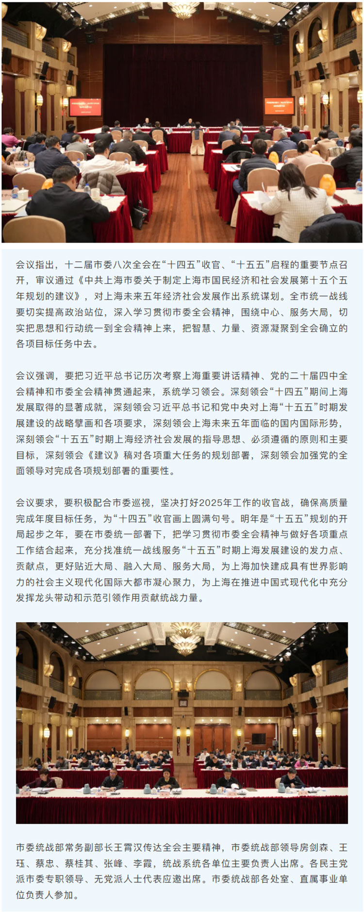12月25日,市委统战部系统召开会议,传达学习十二届市委八次全会精神。市委常委、统战部部长陈通主持会议并讲话。