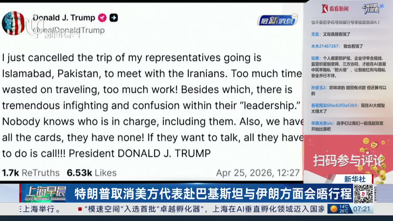 当地时间4月25日,美国总统特朗普取消了美方代表前往巴基斯坦首都伊斯兰堡“与伊朗方面会晤”的行程。在接受记者采访时,特朗普表示,伊朗本应提供更好的条件。他同时强调,美方“掌握着所有筹码”,伊方如果想谈,“直接致电即可”。