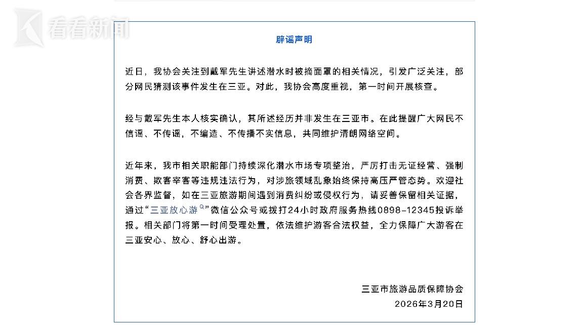 近日,我协会关注到戴军先生讲述潜水时被摘面罩的相关情况,引发广泛关注,部分网民猜测该事件发生在三亚。对此,我协会高度重视,第一时间开展核查。经与戴军先生本人核实确认,其所述经历并非发生在三亚市。在此提醒广大网民不信谣、不传谣,不编造、不传播不实信息,共同维护清朗网络空间。近年来,我市相关职能部门持续深化潜水市场专项整治,严厉打击无证经营、强制消费、欺客宰客等违规违法行为,对涉旅领域乱象始终保持高压严管态势。欢迎社会各界监督,如在三亚旅游期间遇到消费纠纷或侵权行为,请妥善保留相关证据,通过“三亚放心游”微信公众号或拨打24小时政府服务热线0898-12345投诉举报。相关部门将第一时间受理处置,依法维护游客合法权益,全力保障广大游客在三亚安心、放心、舒心出游。