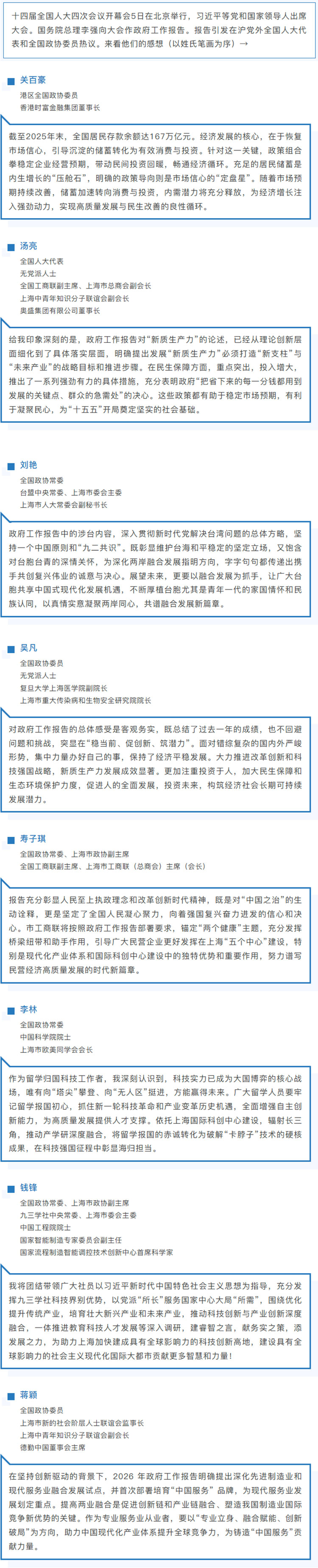 在沪党外全国人大代表、全国政协委员热议2026年政府工作报告②